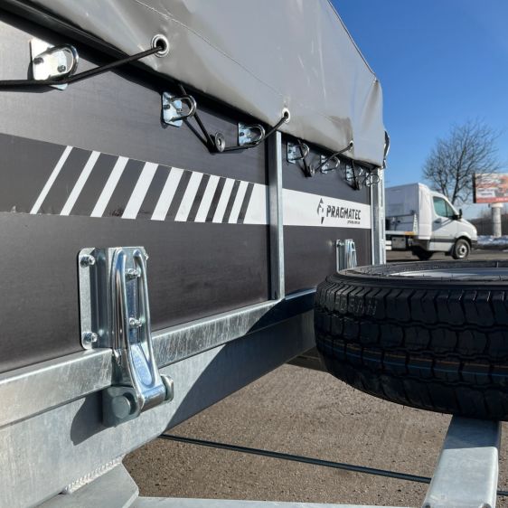 | Комплектація (Причіп) | Опорне колесо 300 кг d 48 гумова шина 200х50 ст. диск PRAGMATEC, задні опорні стійки ,підніжка відкидна (сходинка) ,Ручка-тримач для опорного колеса AL-KO 48 мм (1210182), Упор противідкатний пластиковий чорний HRC, Упор противідкатний пластиковий чорний |