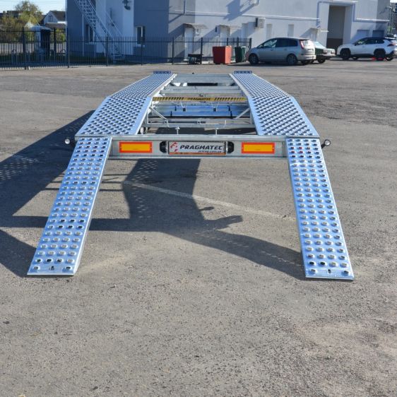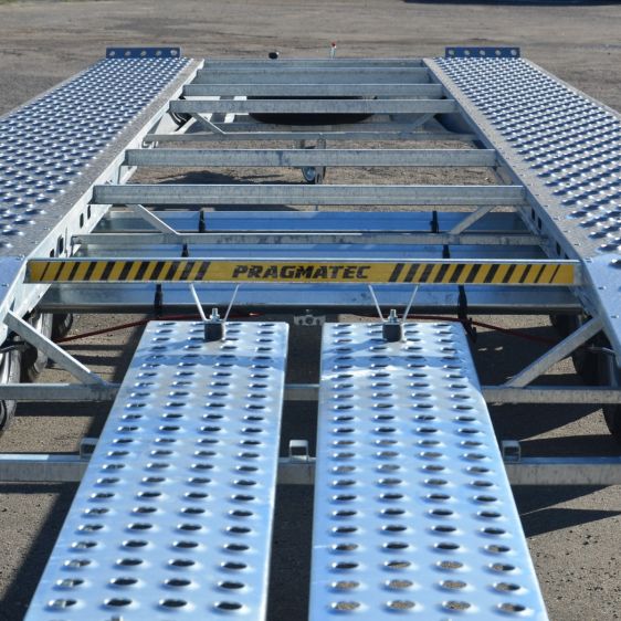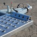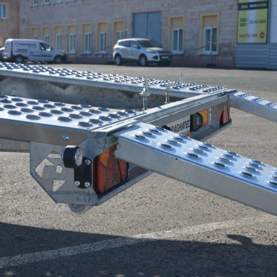 - Лавета укомплектована двома заїзними трапами довжиною 2 м, які надійно закріплені на рамі за допомогою воротків та зафіксовані з іншого боку кронштейнами з відбійниками для того, щоб під час руху вони не гриміли та не загубилися у дорозі.