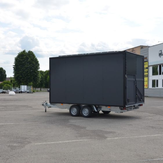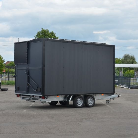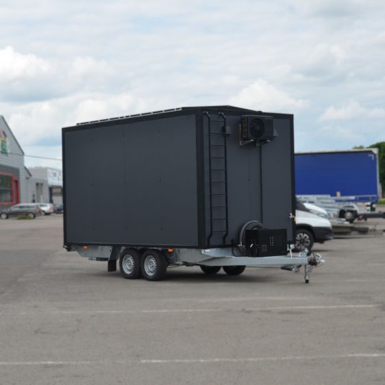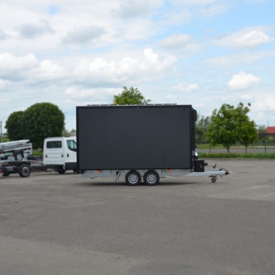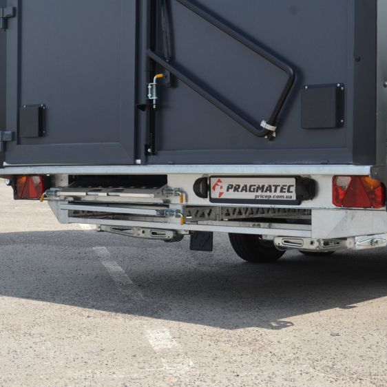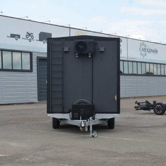| Комплектація (Причіп) | Запасне колесо, трап-сходинки, трап для каталки (зварена рама, зашита рифленим алюмінієм), дизельний генератор на 7 кВт, кондиціонер. Стіни виконані з сендвіч-панелей |